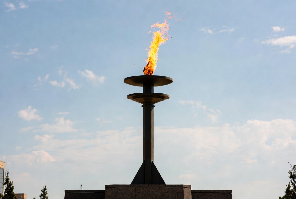 A bright flame burns on a tall structure at a memorial site. The clear sky is visible in the background, creating a striking contrast.