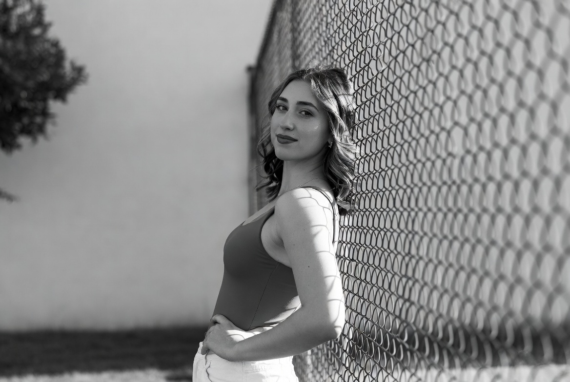 A woman stands confidently next to a chain-link fence. The sunlight casts shadows on her as she engages with the camera.