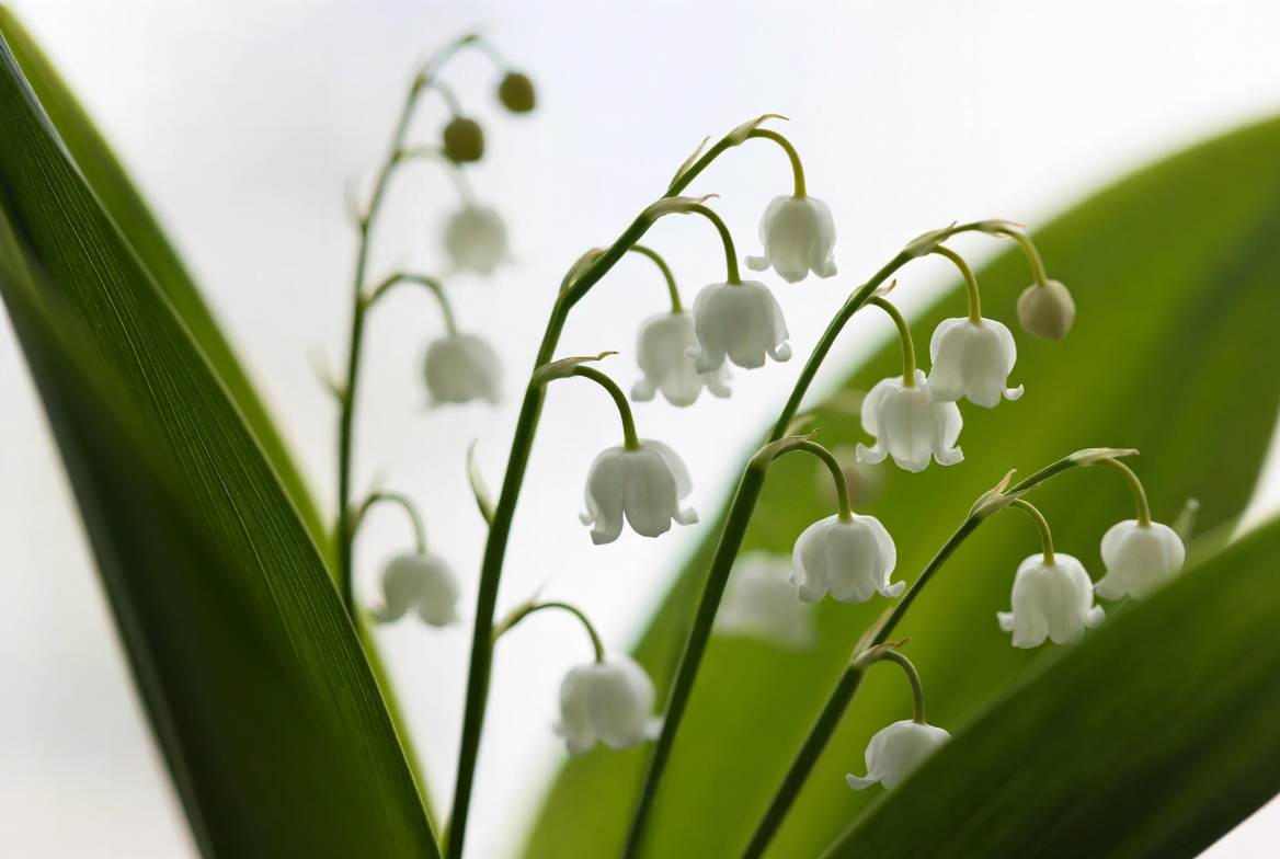 Small white flowers grow on green leaves under natural light in a garden, showing delicate shapes and a fresh look in the spring.