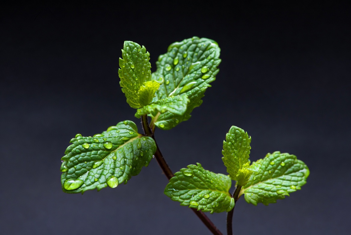 botanical, close view, close-up, cooking, dark background, detail, flora, fresh, garden, green, growing, herb, kitchen, leaf pattern, leaves, mint, nature, plant, texture, water droplets
