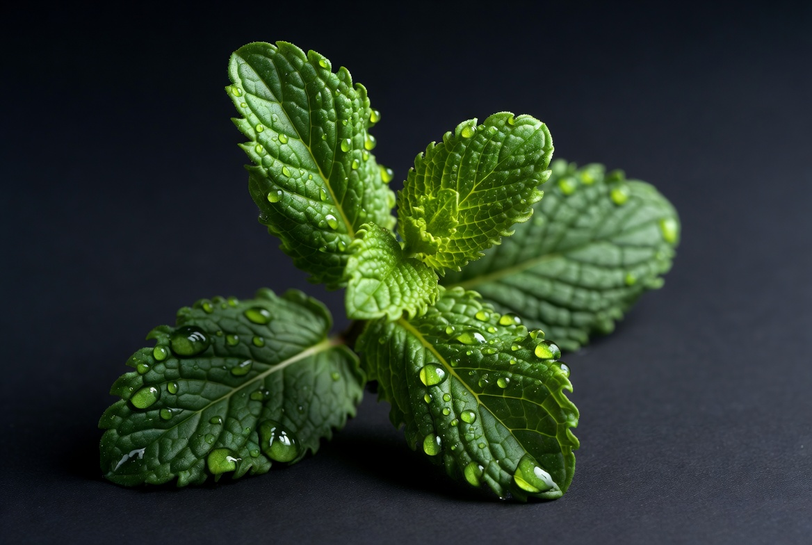 Mint leaves are arranged on a dark background, showing water droplets that highlight their texture and color.