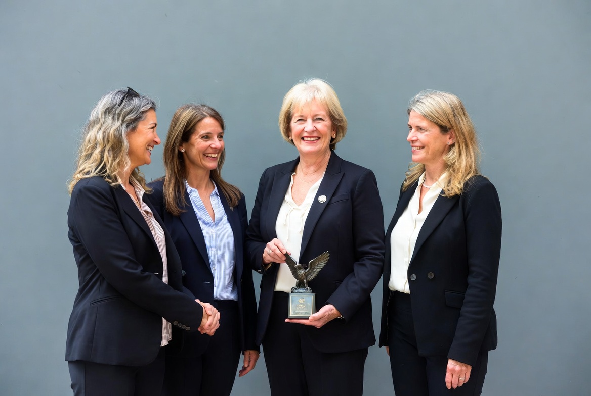 Four women stand together smiling while holding an award. They are dressed in business attire and appear to be at a formal event.