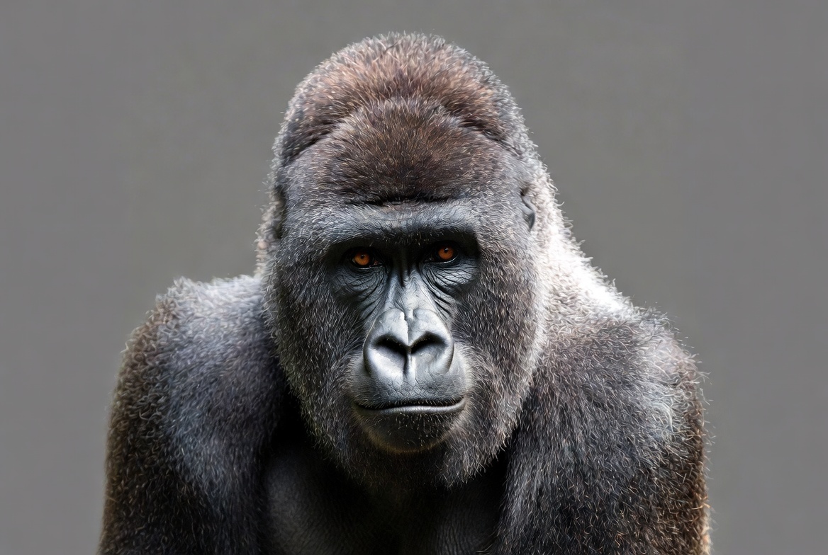 animal, animal behavior, attention, calm, close-up, conservation, expression, gorilla, gray background, habitat, large, mammals, nature, observation, portrait, primate, species, stare, wildlife, zoo