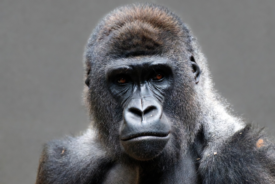 animal, ape, behavior, calmness, close-up, eyes, face, fur, gorilla, gray, habitat, mammal, nature, non-human, portrait, primate, serious, stare, wildlife, zoo