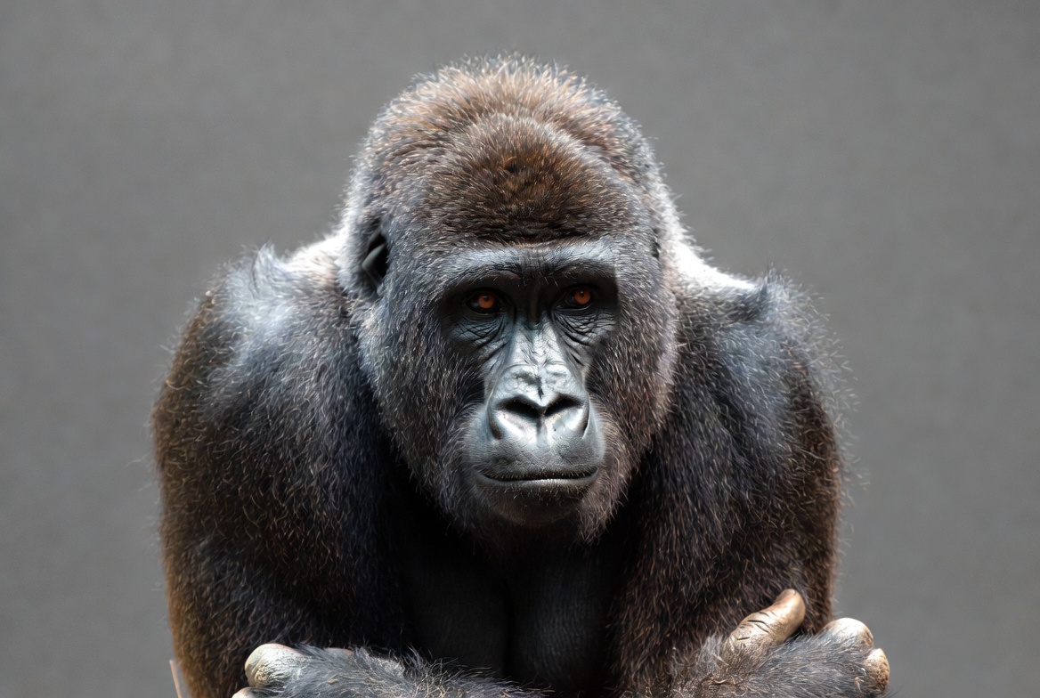adult, animal, animal behavior, animal observation, ape, black fur, close-up, dark background, eyes, gorilla, habitat, looking, nature, primate, serious, sitting, strong, wildlife, wildlife conservation, zoo