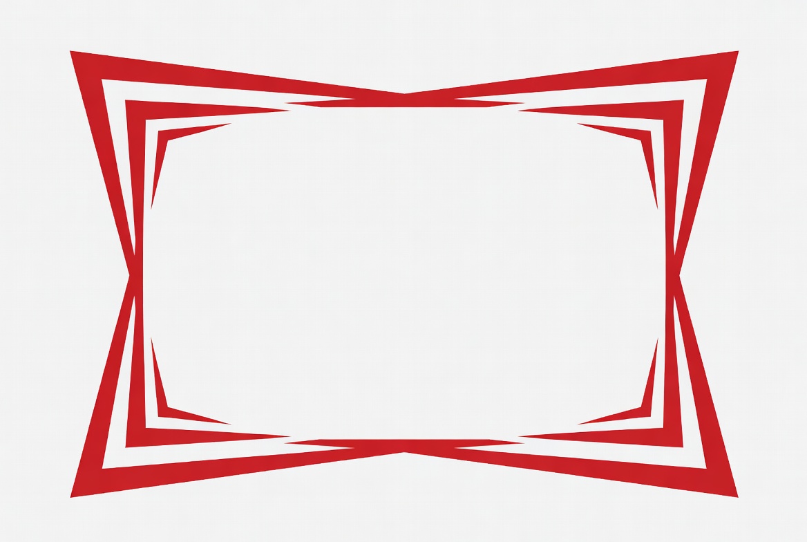 A geometric design features red shapes forming a framed pattern on a plain white background. The shapes create a dynamic visual effect.