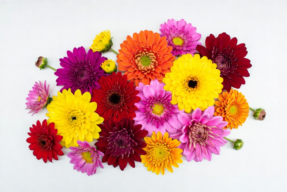 Various colorful flowers are arranged on a white table. The flowers include different types and sizes, showcasing vibrant colors.