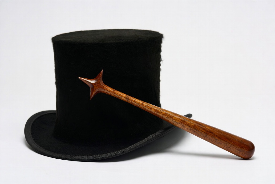 accessories, black hat, costume, craftsmanship, creativity, design, entertainment, hat display, illusion, magic, magic wand, party, performance, props, style, theater, top hat, vintage, wand display, wooden wand