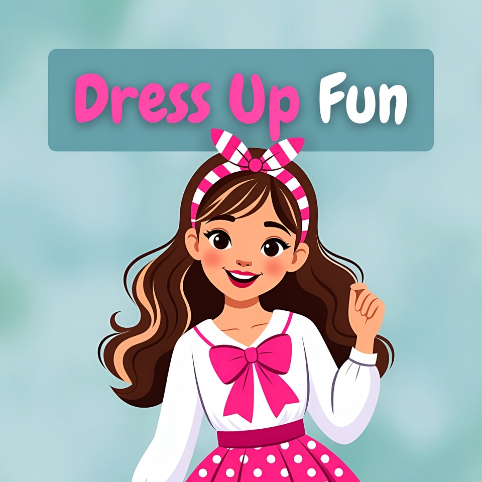 A girl is smiling and posing with a bow and polka dot skirt. She enjoys a dress up activity. The background is light and colorful.