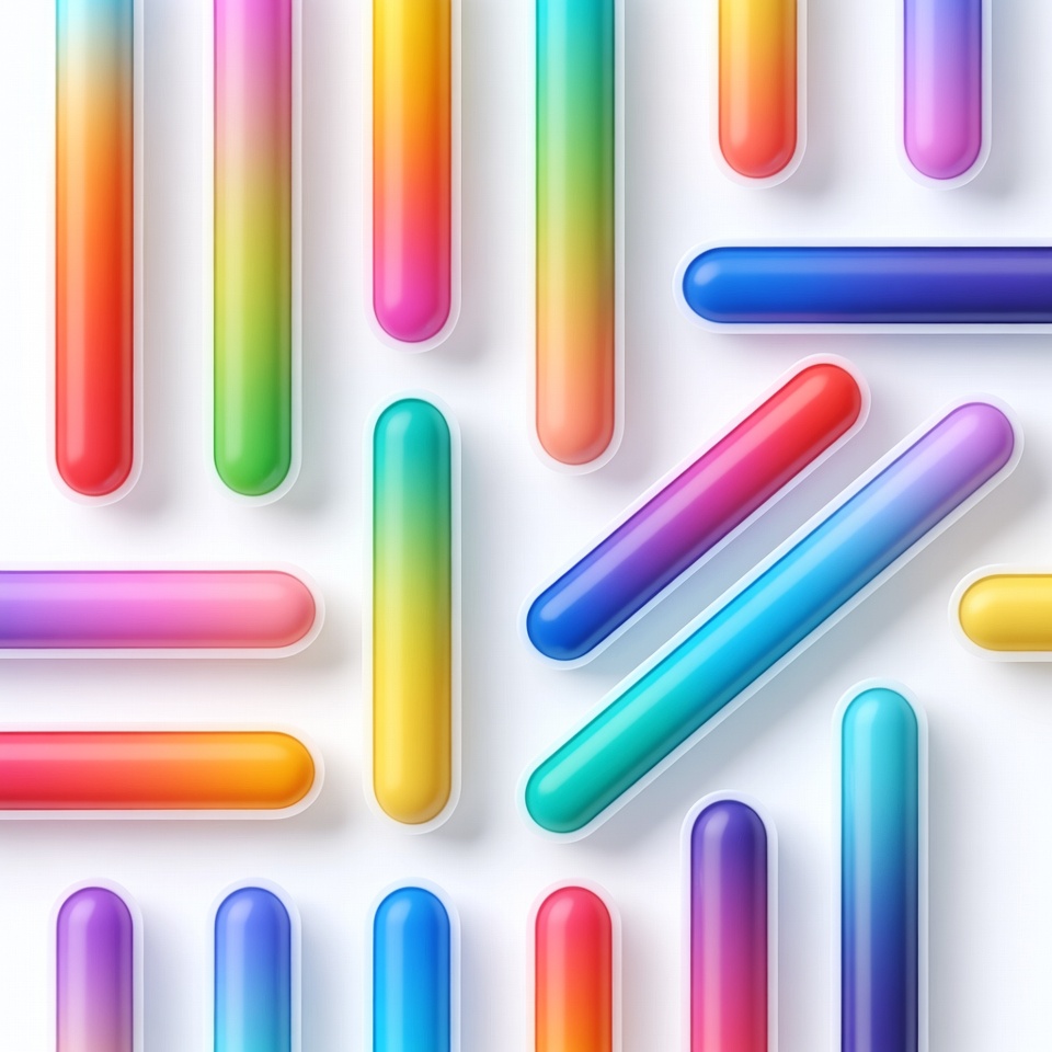 Different colored bars are arranged on a white surface. They are varied in size and orientation, creating a lively pattern.