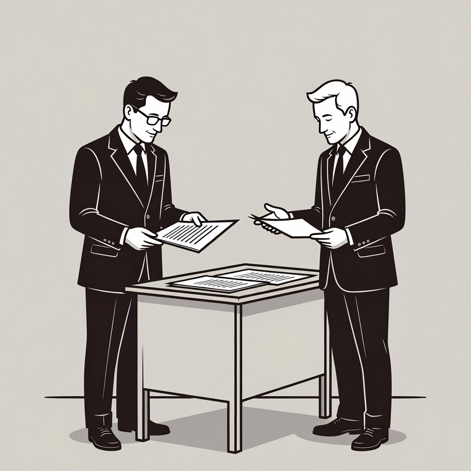 Two men in suits are discussing papers at a table. They appear focused on reviewing documents and exchanging ideas.