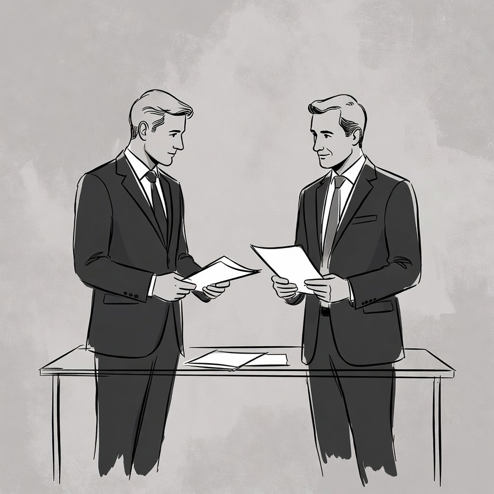 Two men stand at a table exchanging papers. Both wear suits and appear engaged in conversation about the documents in their hands.