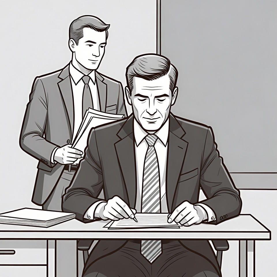 Two men are in an office. One man stands behind another who writes on a document at a desk. Papers are on the desk.