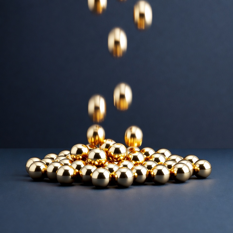 Gold balls drop from above and create a pile on the flat surface below. The scene focuses on the movement and arrangement of the balls.