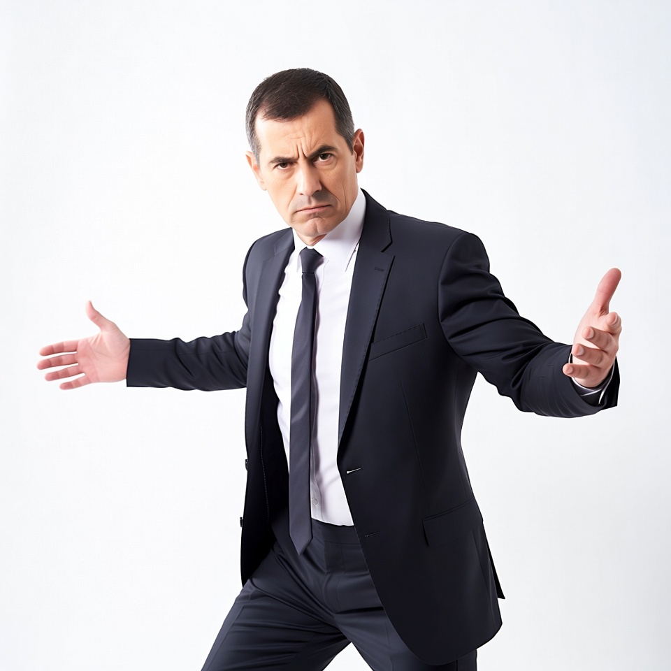 A man stands with his arms open, wearing a suit and tie. He has a serious expression and appears ready to engage.