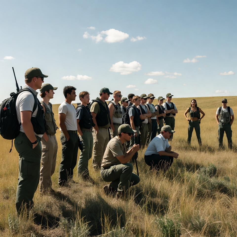 animals, conservation, ecosystem, education, environment, field, grassy area, group, hands-on, instructor, landscape, learning, nature, observation, open space, outdoor, science, students, teamwork, wildlife