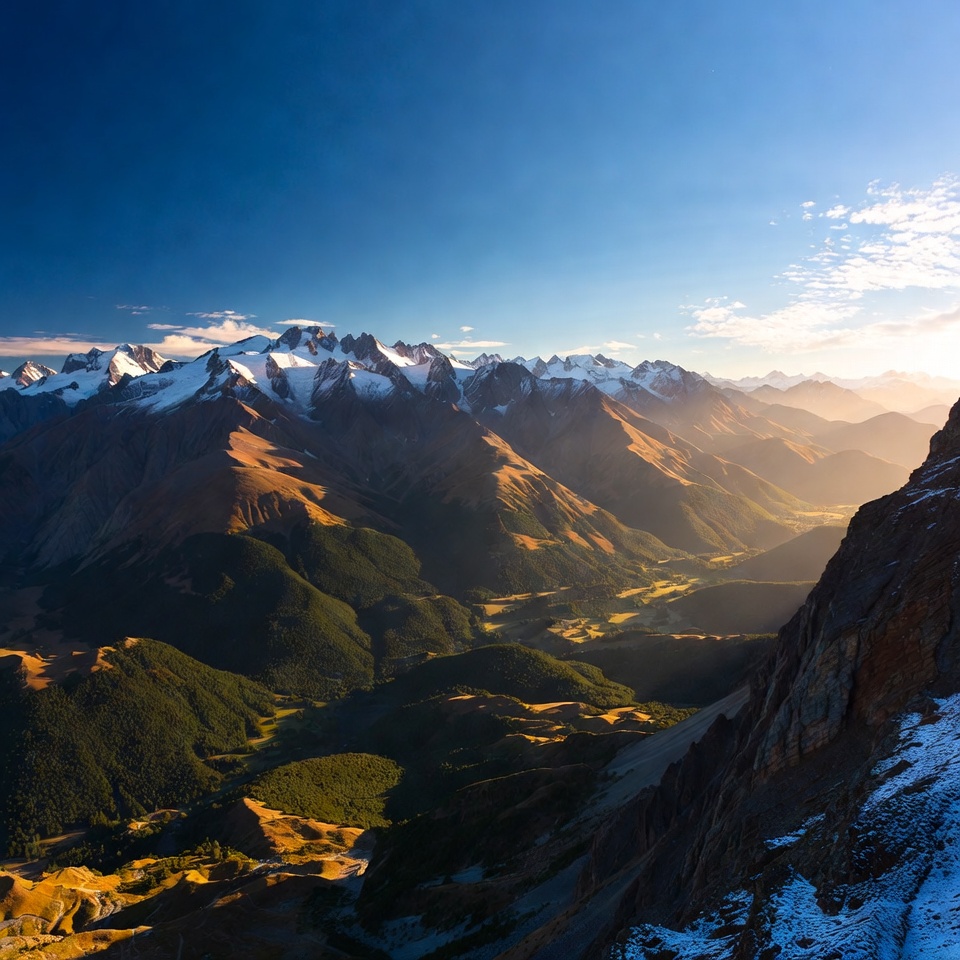 View of mountains in the Andes during sunset. The sun lights up the peaks and valleys, creating a vibrant scene.