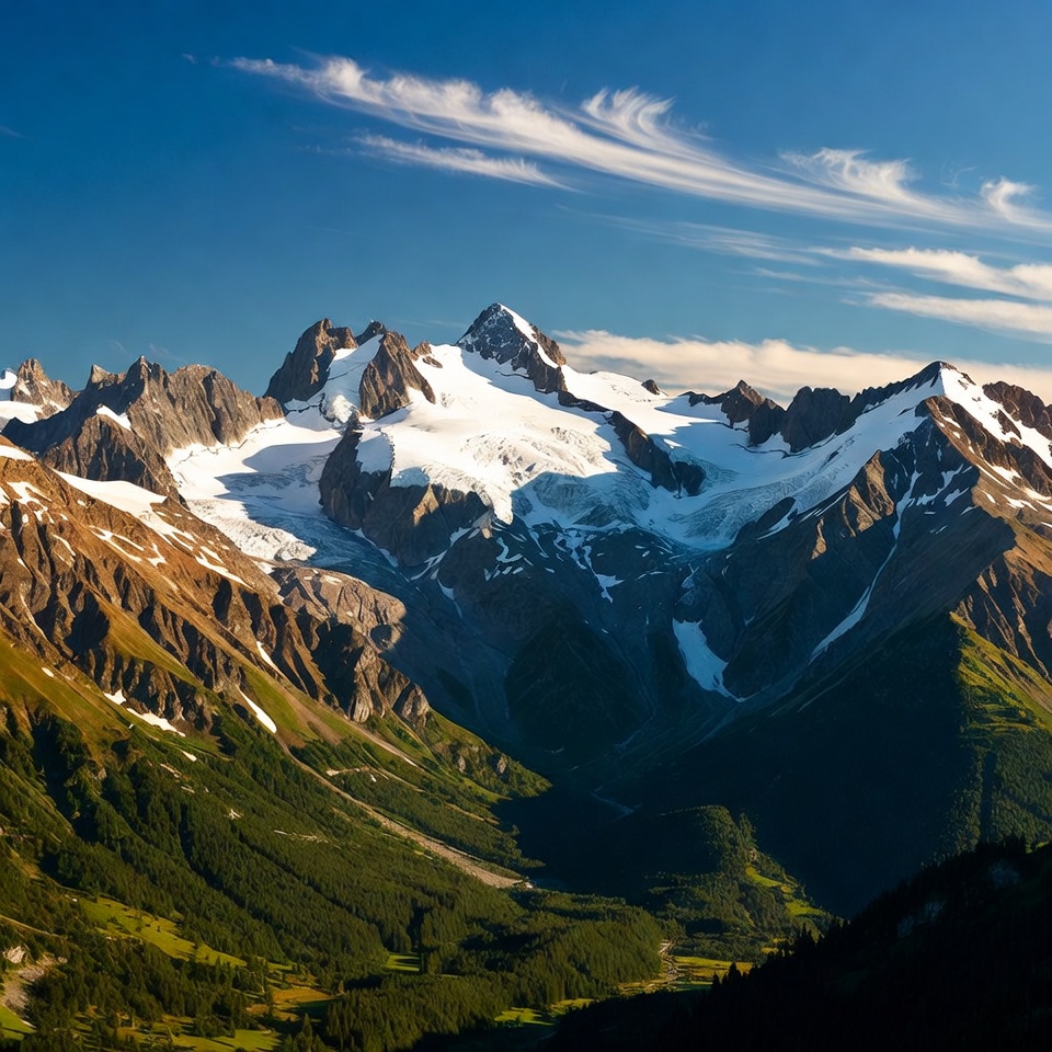 Snow-capped mountains rise under clear blue skies. Green valleys and rugged peaks create a stunning landscape during daylight hours.