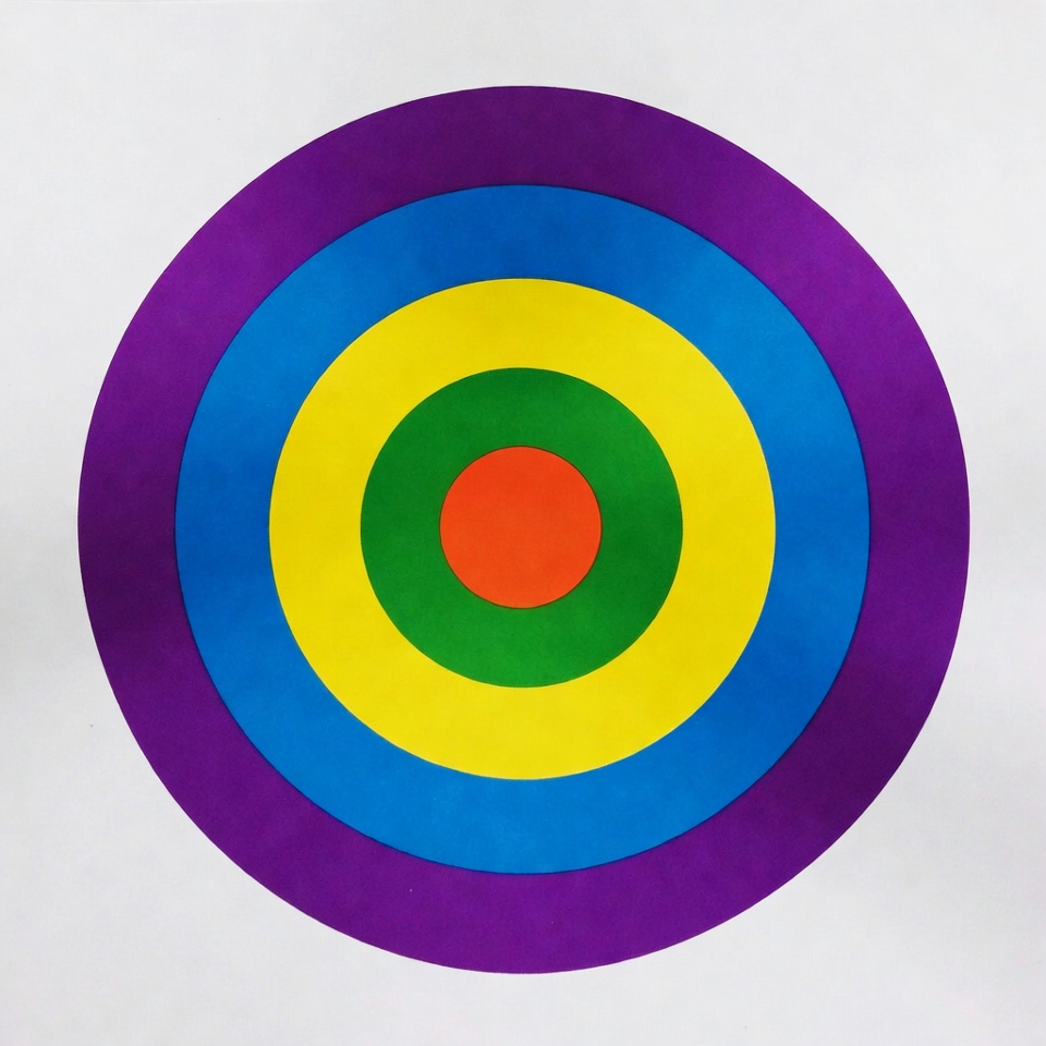 A round target with multiple colorful rings is displayed on a plain white background. The center is orange, surrounded by other colors.