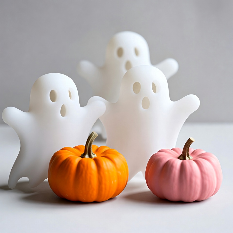 Three ghost figures and two pumpkins are arranged on a table. The scene is festive and captures the spirit of Halloween.