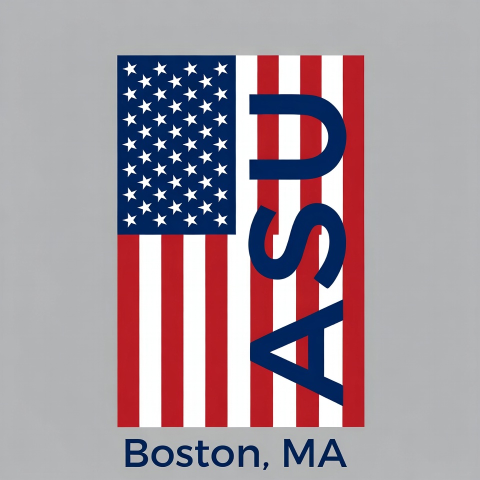 A creative flag design shows red and white stripes with blue accents. The letters ASU are prominently displayed with the city name Boston, MA.