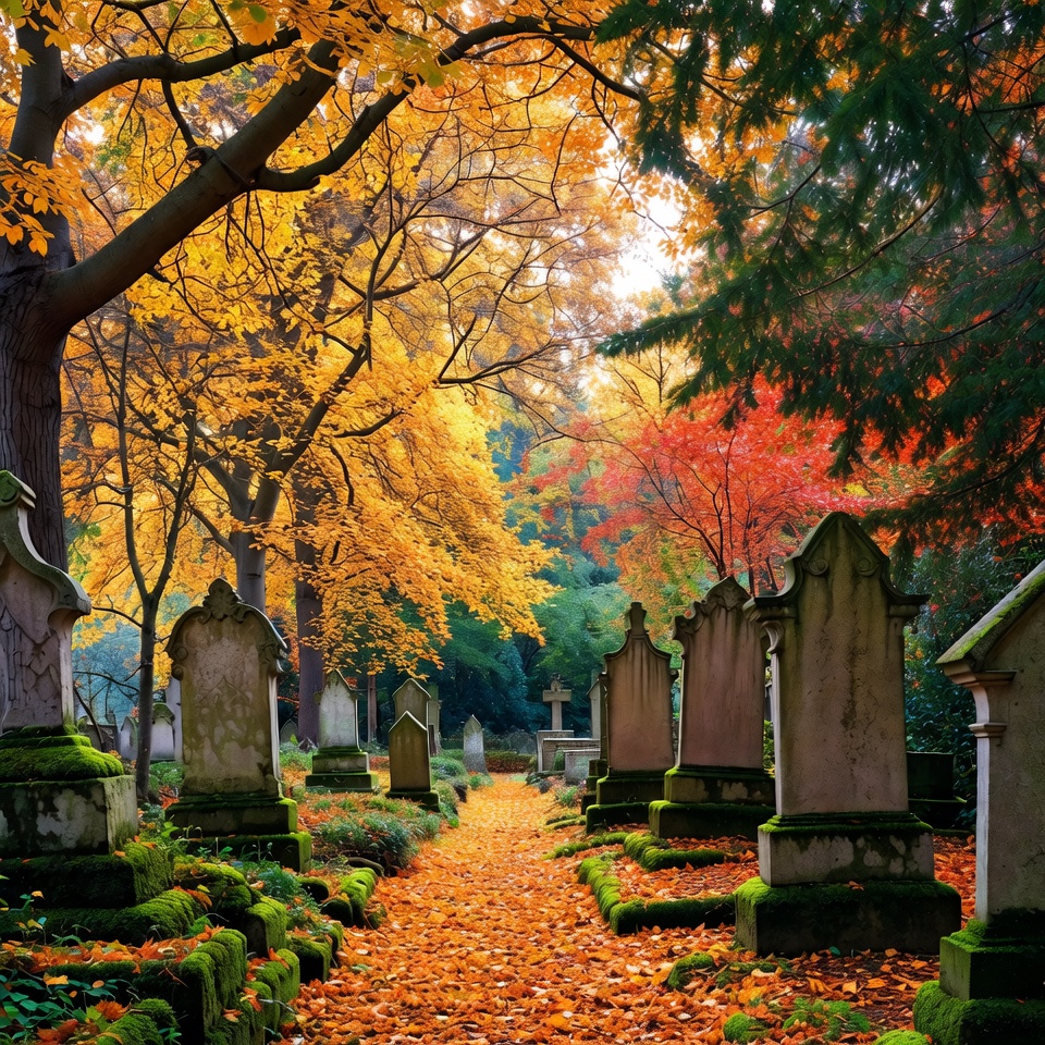 Autumn leaves cover the ground in a cemetery. Gravestones stand among trees displaying red and orange foliage. Sunlight filters through.