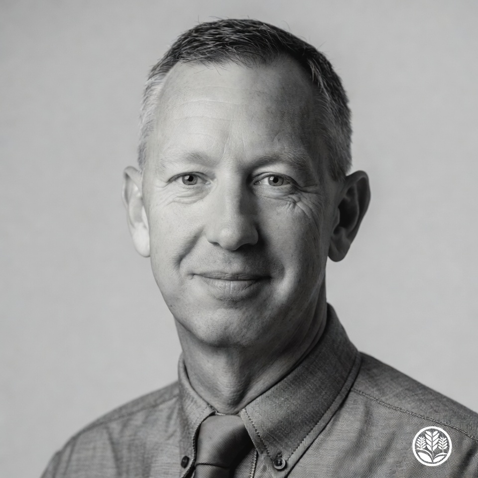 Man with smile stands indoors, wearing a button-up shirt. Lighting showcases his features and creates a friendly atmosphere.