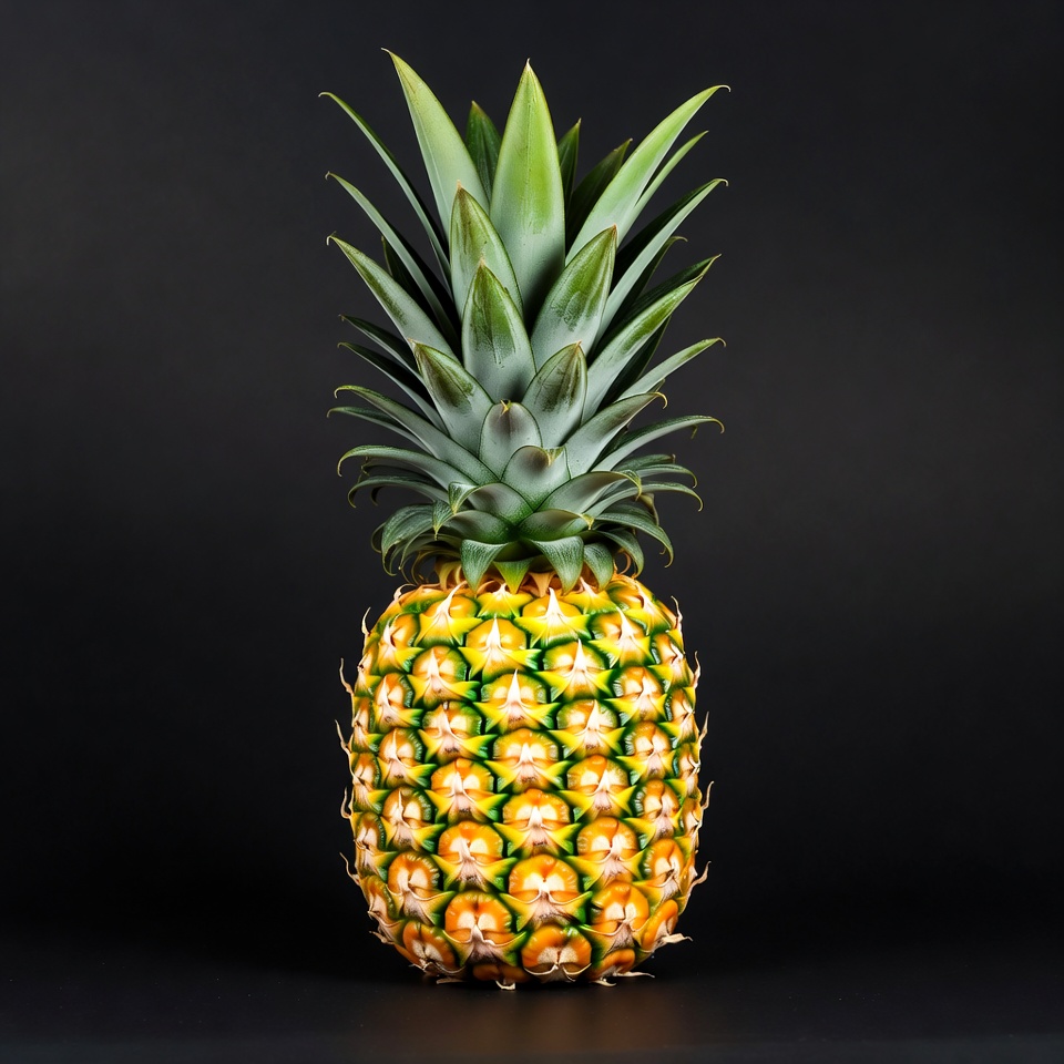 agriculture, ananas comosus, black background, dieting, exotic, food, freshness, fruit, green, healthy, leaves, nutritious, pineapple, produce, ripe, still life, studio shot, tropical fruit, vitamin, yellow