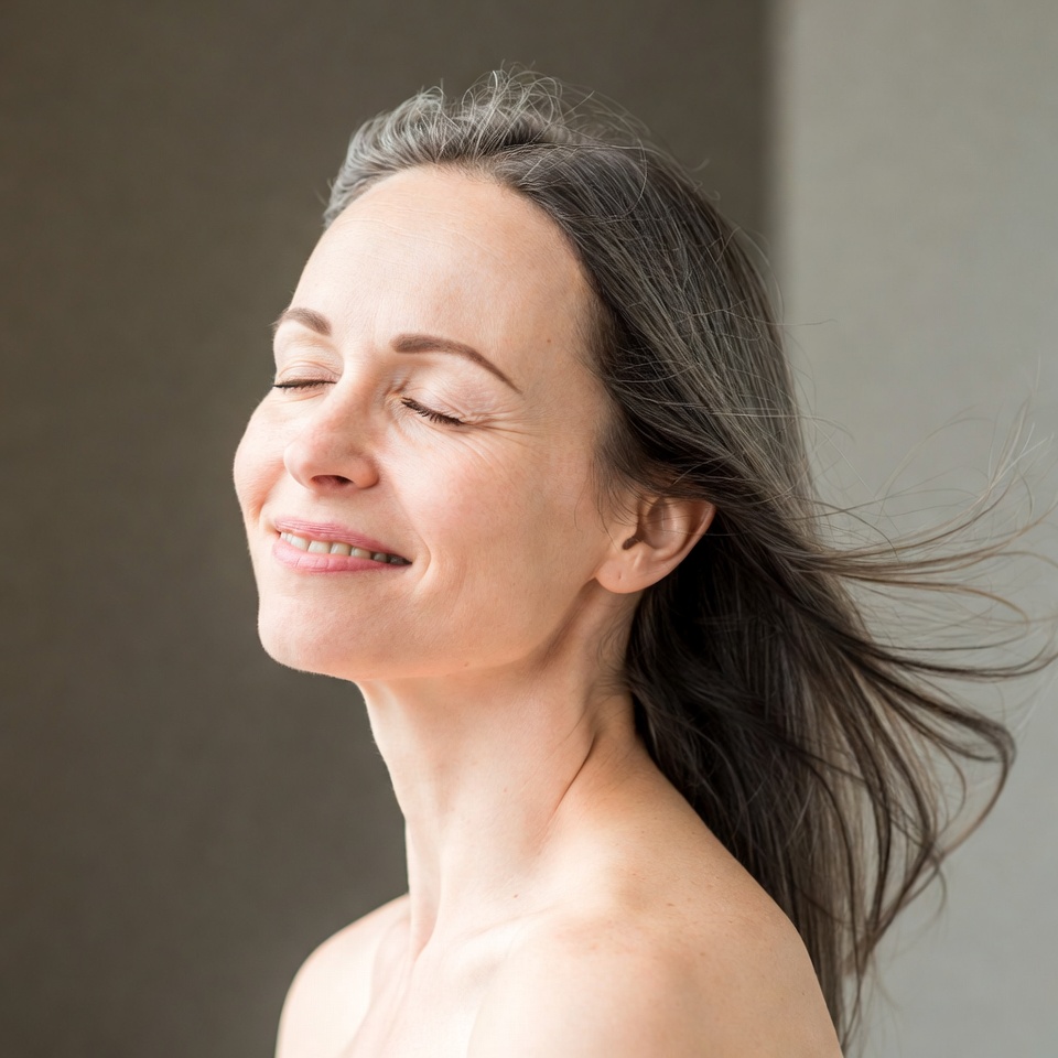aging, beauty, contentment, expression, eyes closed, face, graceful, grey hair, hair blowing, middle aged, neck, portrait, relaxed, serene, shoulders, skin, smiling, wellbeing, wind, woman
