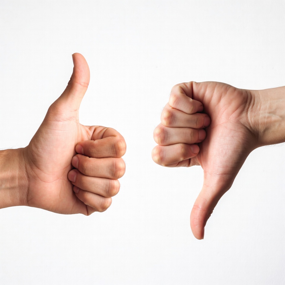 Two hands are raised. One hand shows a thumbs up while the other shows a thumbs down. The background is plain and light.