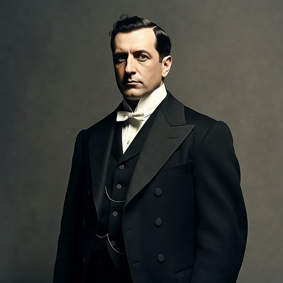 accessories, black suit, bow tie, clothing, event, formal attire, gentleman, indoor setting, indoors, man, menswear, portrait, serious expression, standing, suit, timeless, traditional, vest, vintage style, white shirt
