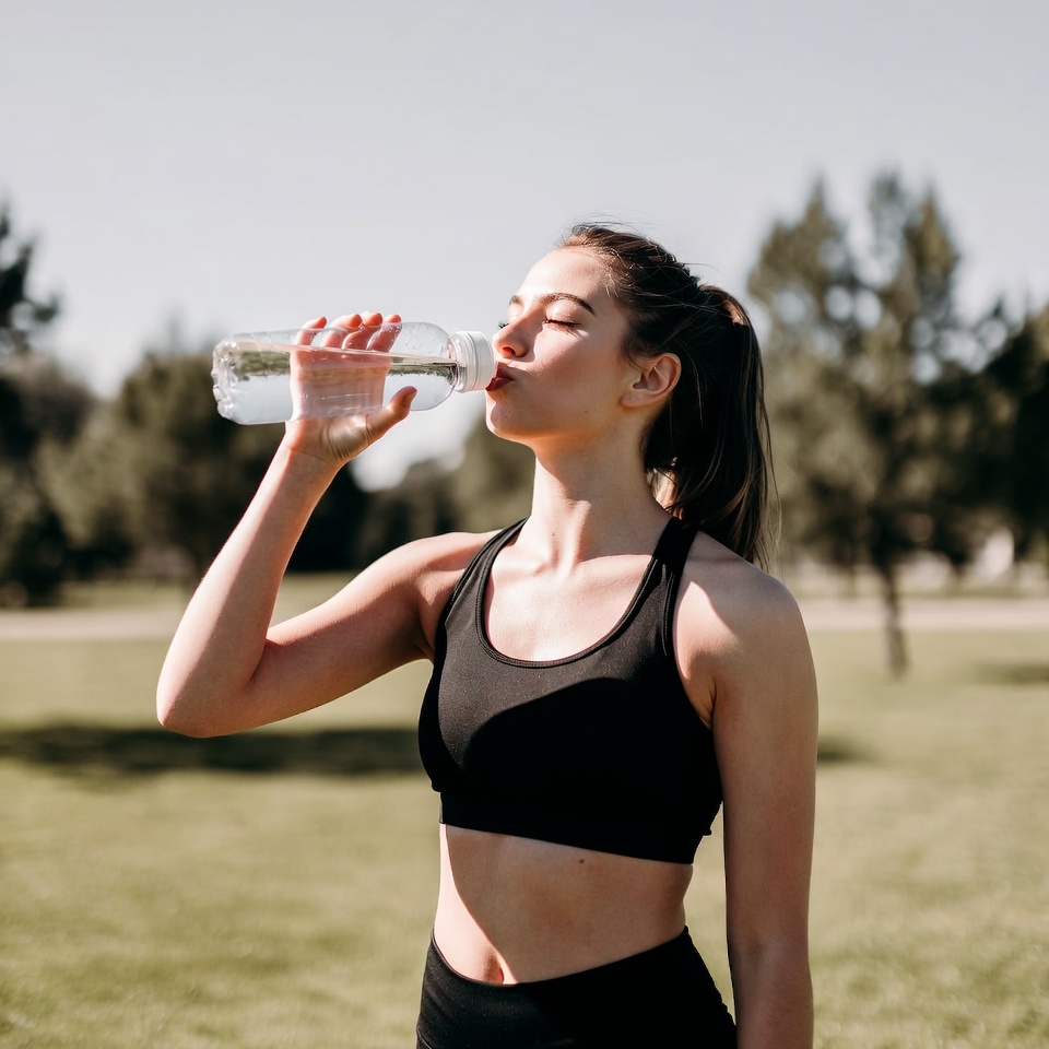 A woman wearing sports attire drinks water from a bottle in a green park during daytime. She enjoys refreshment after exercising outdoors.