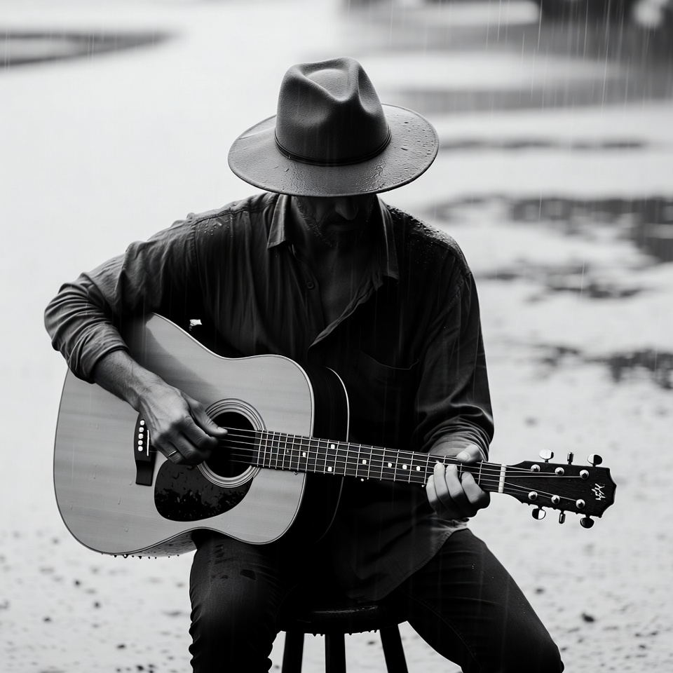 A person plays guitar while sitting on a stool in the rain near a body of water. The scene shows a connection between music and nature.