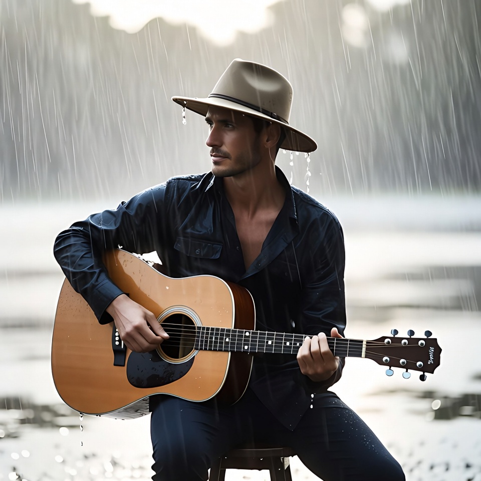 acoustic, atmosphere, cloudy, focus, guitar, man, moments, music, musician, nature, outdoors, performance, playing, rain, singing, stool, strumming, talent, water, wet