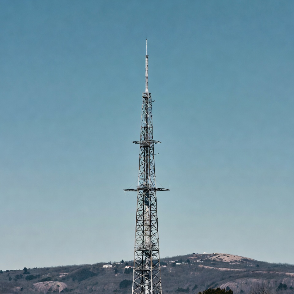 A tall communication tower stands alone against a clear blue sky on a sunny day in a hilly area. It is surrounded by distant hills.