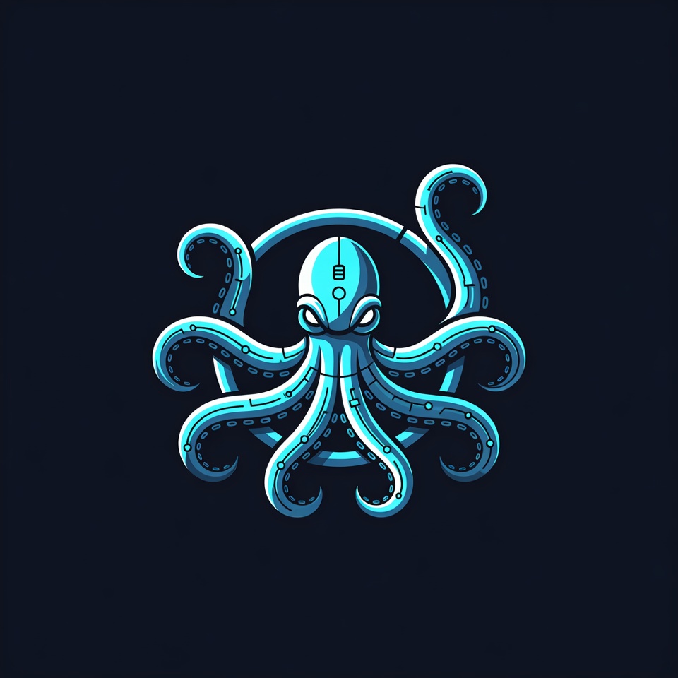 A blue octopus with robotic details displays its tentacles. The design is modern and set against a dark background.