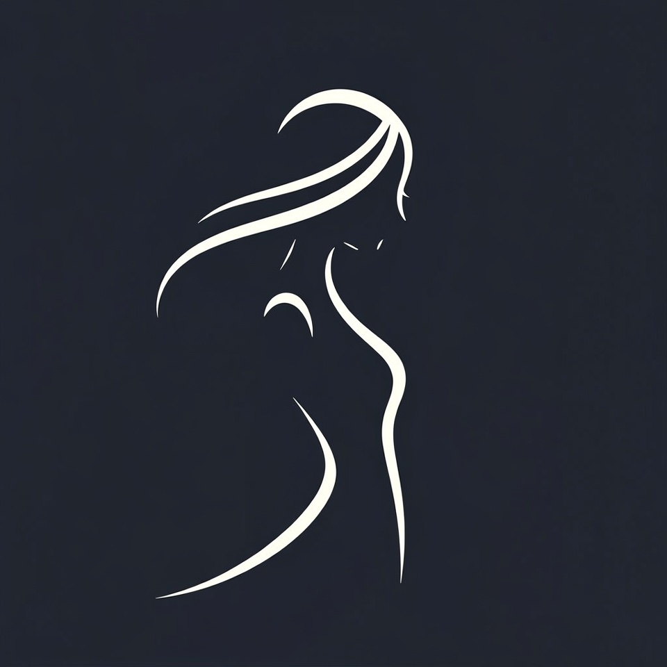 A simple outline of a woman is shown. The figure has flowing hair and a curvy shape. It is set against a dark background.