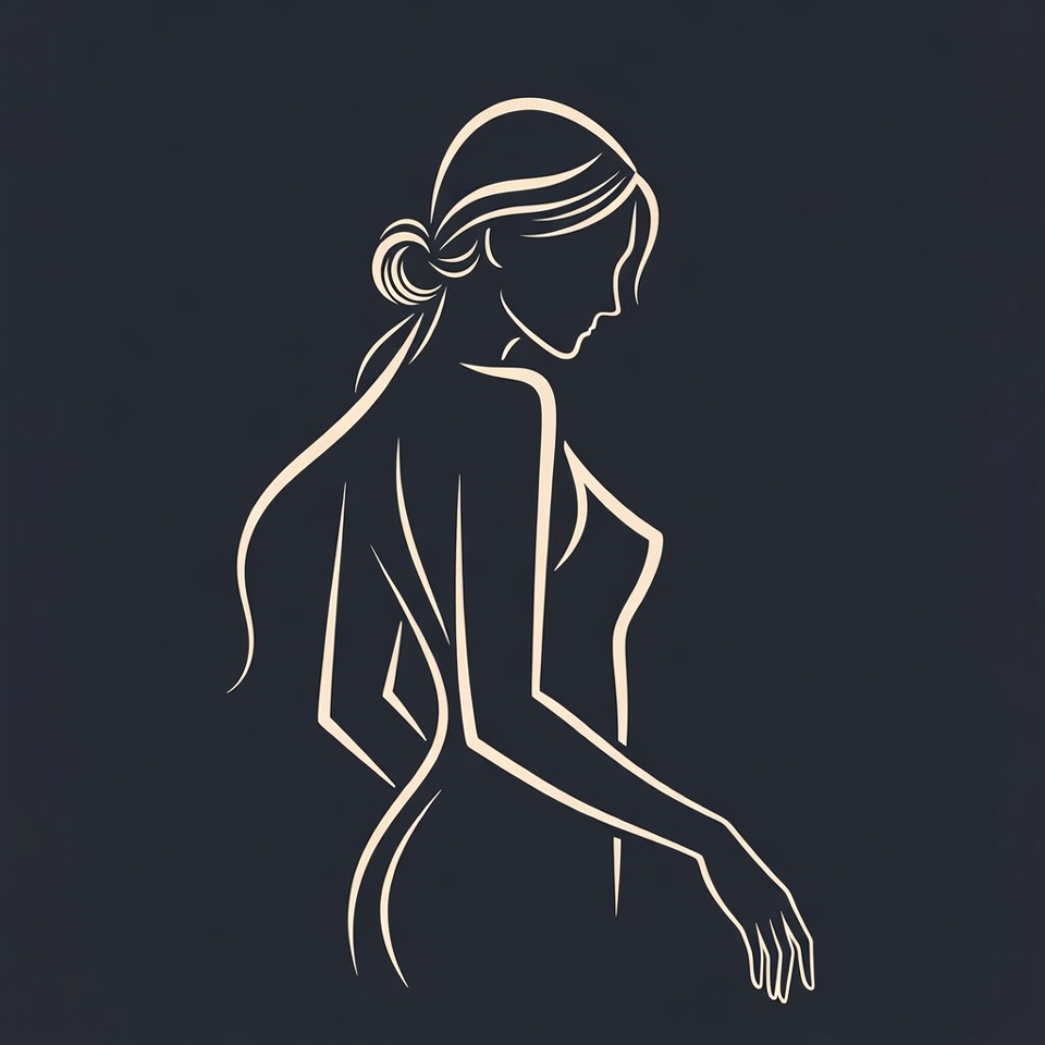 A minimalist drawing shows the profile of a woman. She poses gracefully, highlighting her form with clean lines against a dark background.
