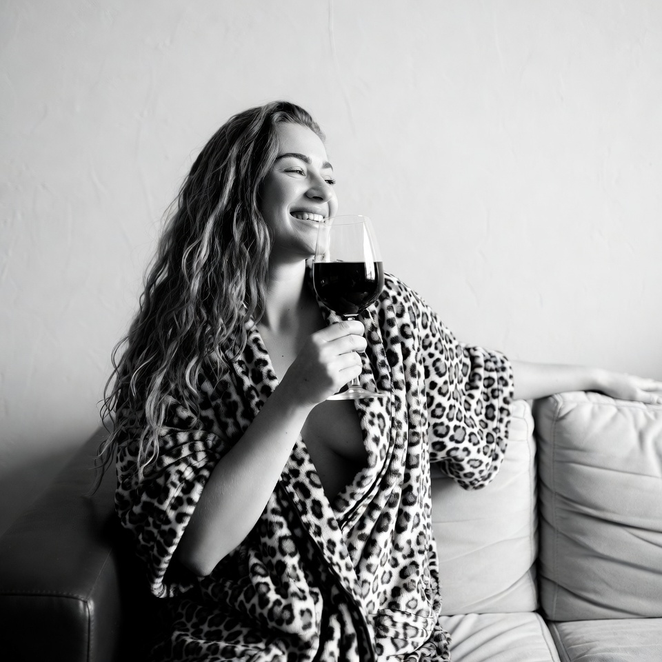 beverage, casual, comfort, couch, drink, happiness, home, home decor, indoor, joyful, leisure, lifestyle, portrait, relaxation, robe, sitting, smiling, style, wine, woman