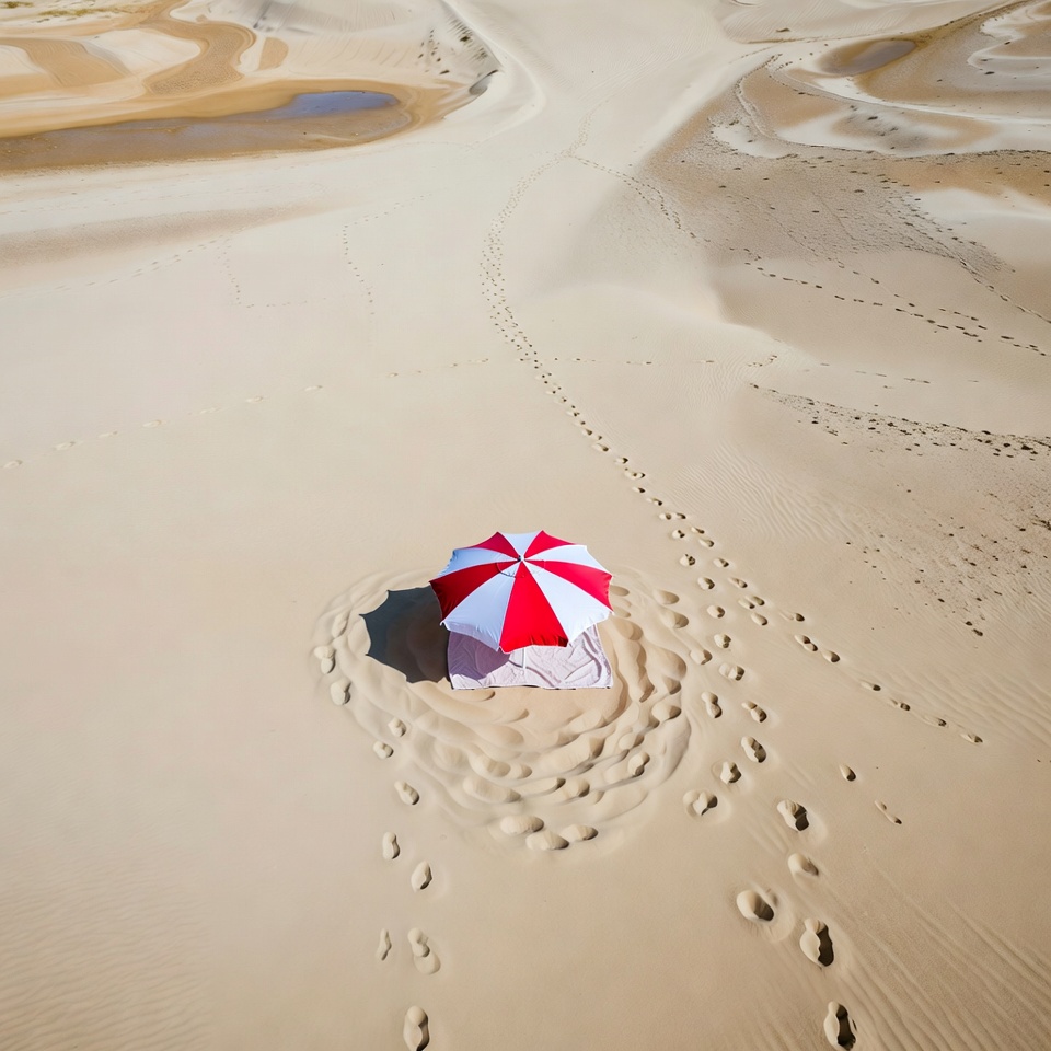 A red and white umbrella stands alone on the sandy desert. Footprints surround it, showing traces of visitors in the heat.