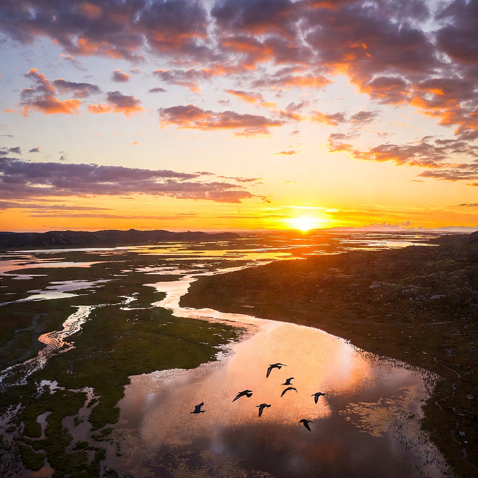 Sunset over wetlands with flying birds