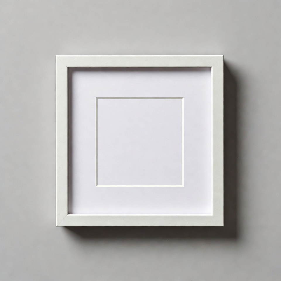 A blank white frame is hanging on a gray wall. The frame has a simple design with no artwork inside.