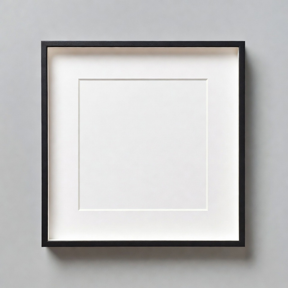 A square black frame sits against a gray wall. The frame is empty and has a white mat inside. Light hits the frame evenly.