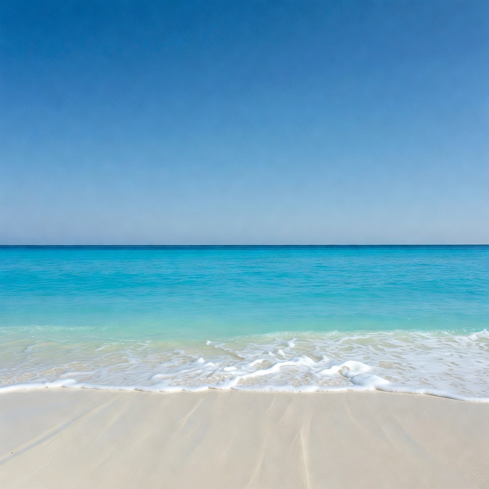 Waves gently roll onto a sandy beach under a clear blue sky. The calm ocean is bright and inviting at midday.