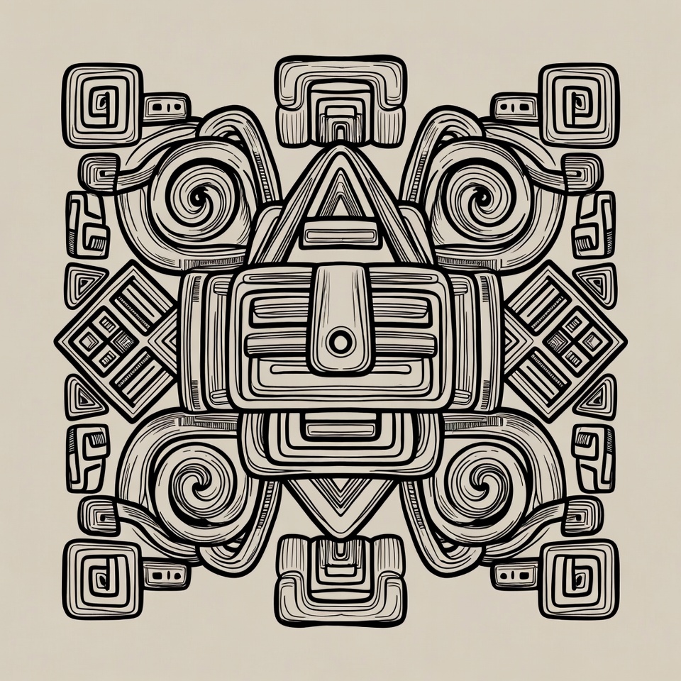 A detailed design featuring various geometric shapes and patterns inspired by ancient culture, displaying intricate lines.