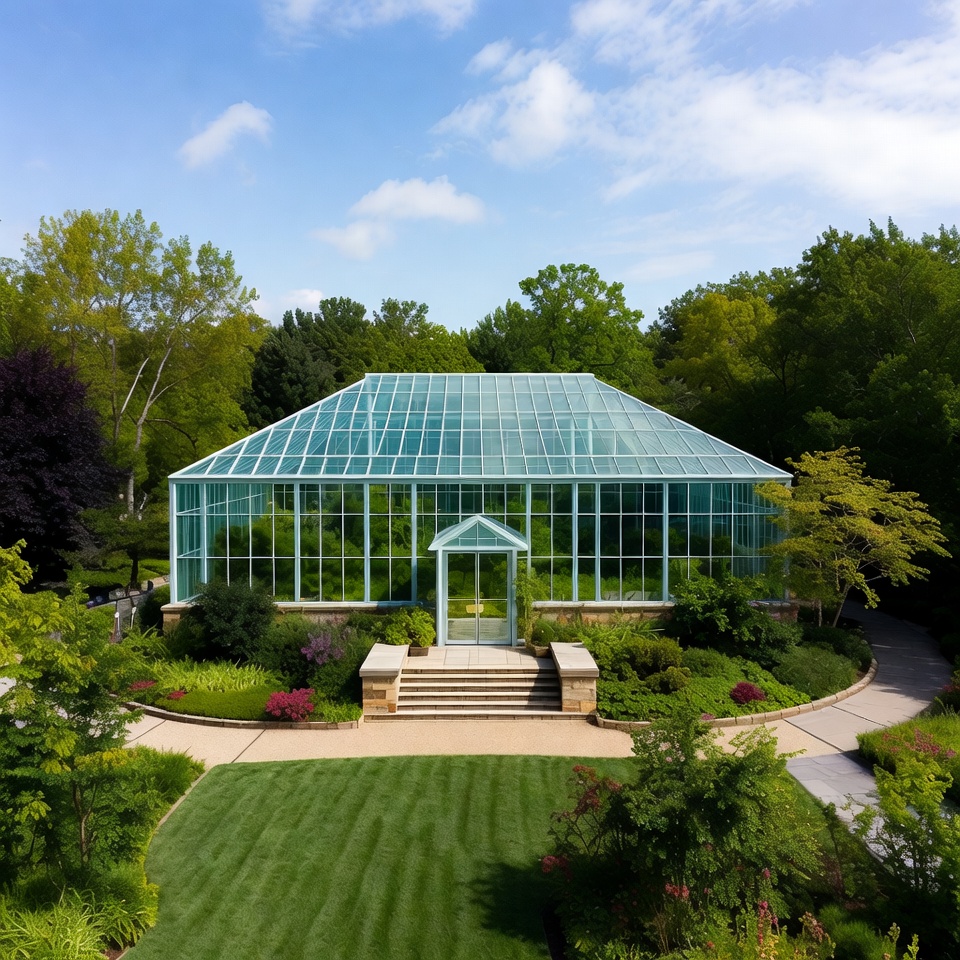 A large greenhouse stands in the center of green gardens under a clear blue sky, showcasing glass walls and a well-maintained landscape.