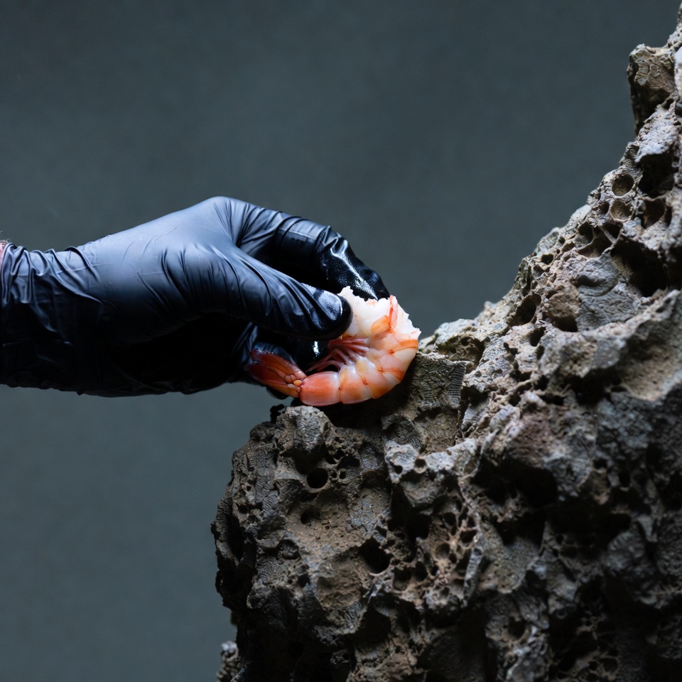 A hand with a black glove is lifting a shrimp next to a rough stone surface. The focus is on the hand and shrimp.