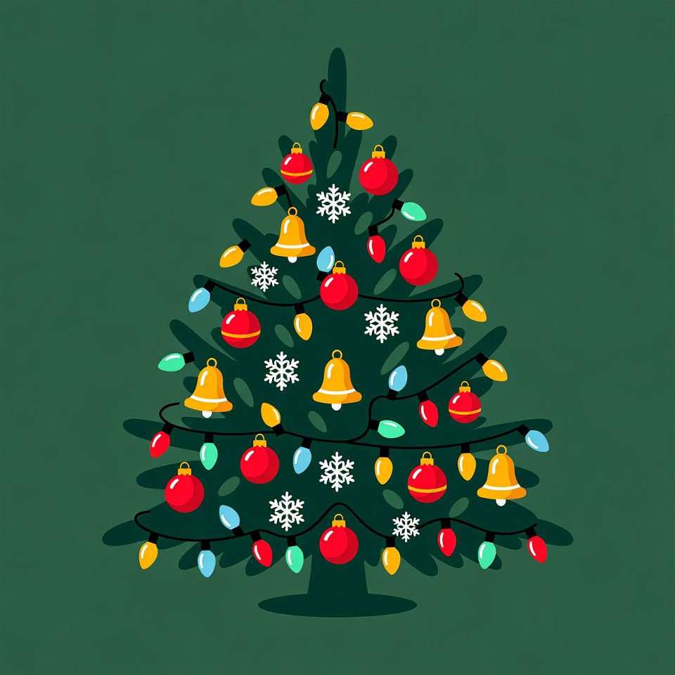 A decorated Christmas tree stands against a green background. The tree is adorned with colorful ornaments, bells, and lights.
