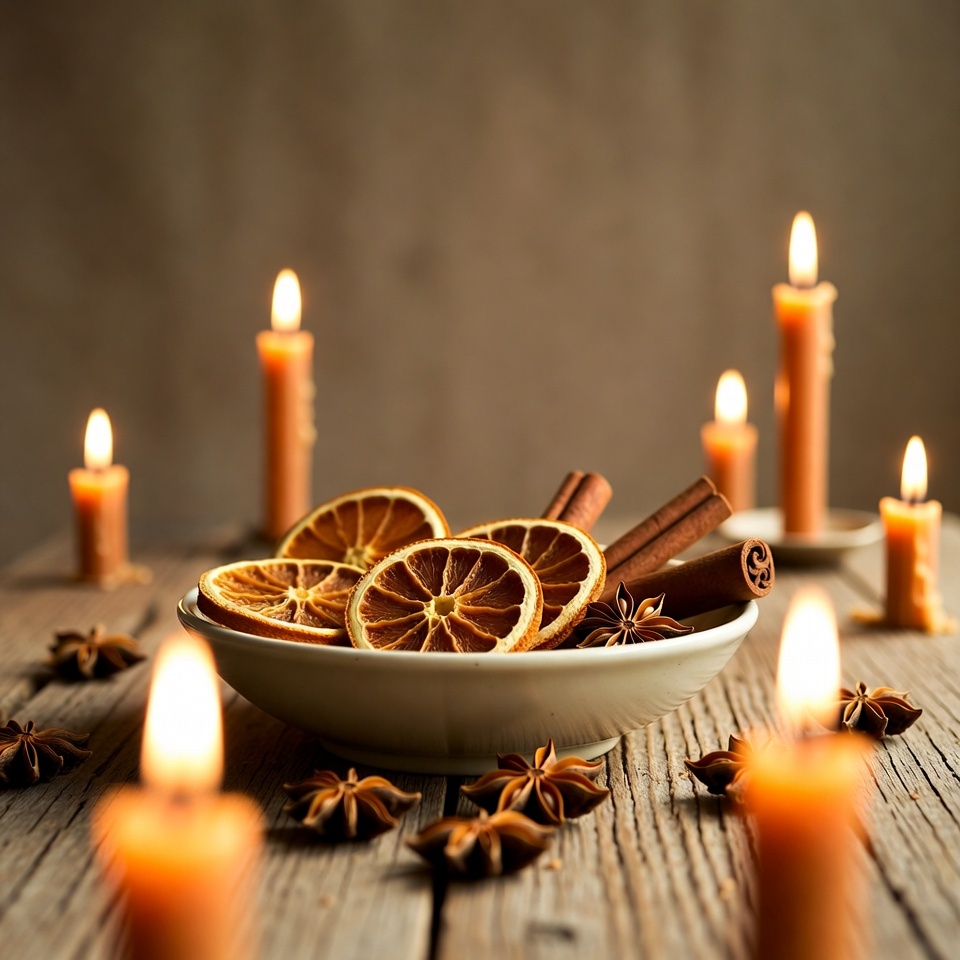 Dried orange slices and cinnamon sticks are arranged in a bowl on a wooden table, surrounded by lit candles and star anise.