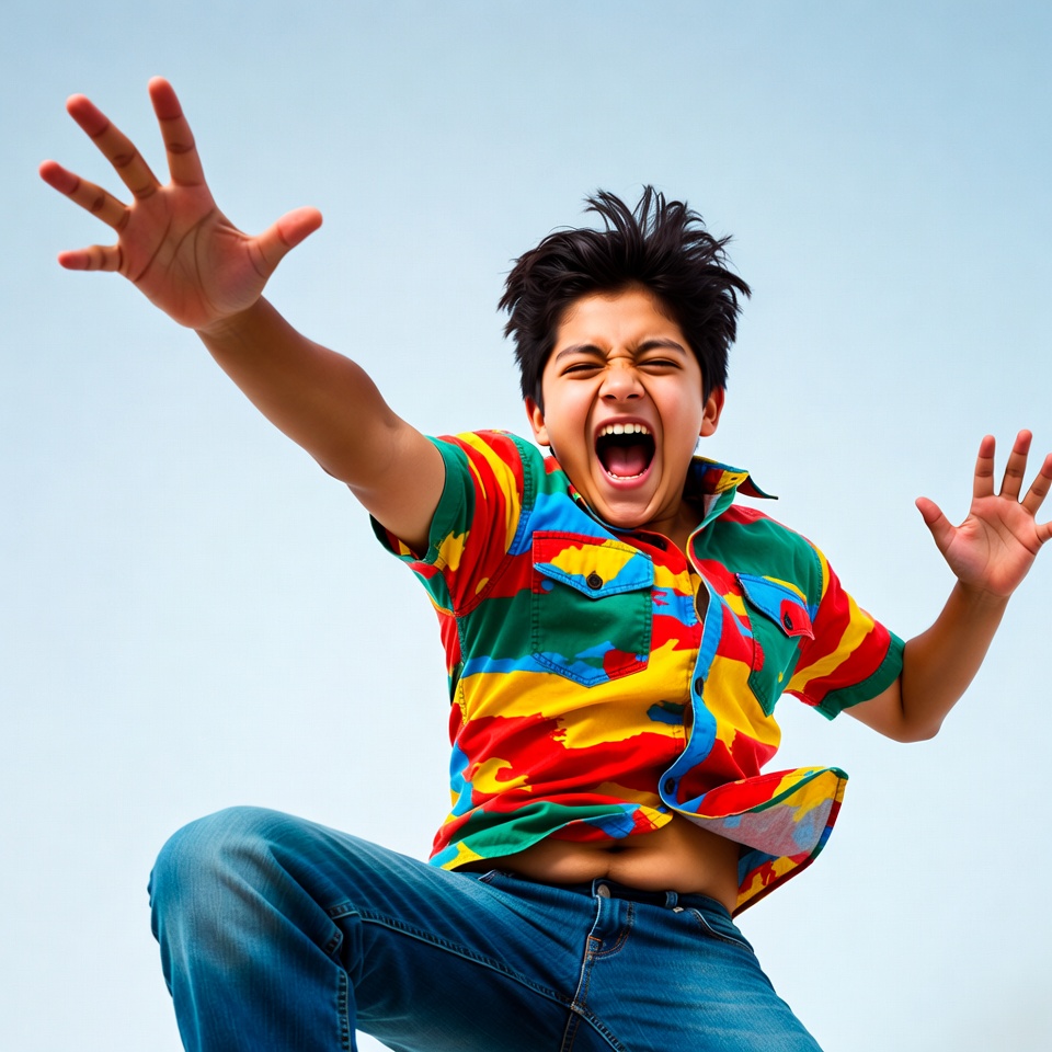 action, blue background, boy, colorful shirt, dance, energy, excitement, expression, freedom, fun, happiness, jeans, joy, jump, motion, play, shout, spirit, summer, youth